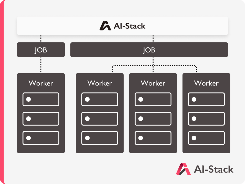 - Overview: The AI-Stack platform can allocate training tasks across multiple nodes based on demand, leveraging distributed training technology to organize multiple containers into training groups. These groups process massive datasets in parallel, effectively reducing model training time, improving computational efficiency, and maximizing resource utilization.